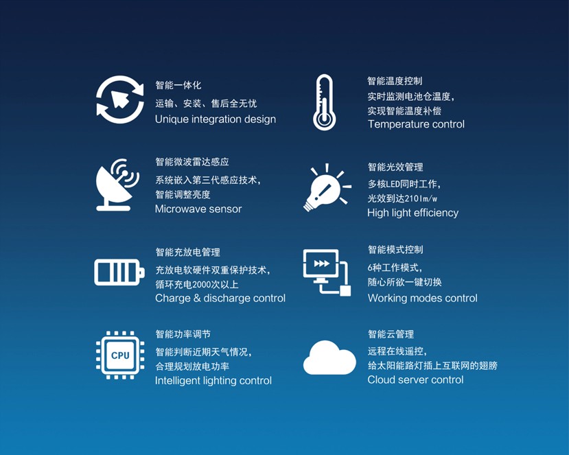 源碼不僅在產(chǎn)品的核心配件上追求高標(biāo)準(zhǔn),在研發(fā)的技術(shù)領(lǐng)域更是引先于行業(yè)。源碼太陽能智慧路燈搭載了智能監(jiān)測(cè)與控制系統(tǒng),集智能一體化、智能微波雷達(dá)感應(yīng)、智能充放電管理、智能功率調(diào)節(jié)、智能溫度調(diào)節(jié)、智能光效管理、智能模式控制、智能云管理八大核心技術(shù)為一體,通過核心技術(shù)的組合工作,使路燈更加智能化,有效延長了太陽能路燈的壽命,達(dá)到最佳照明效果。