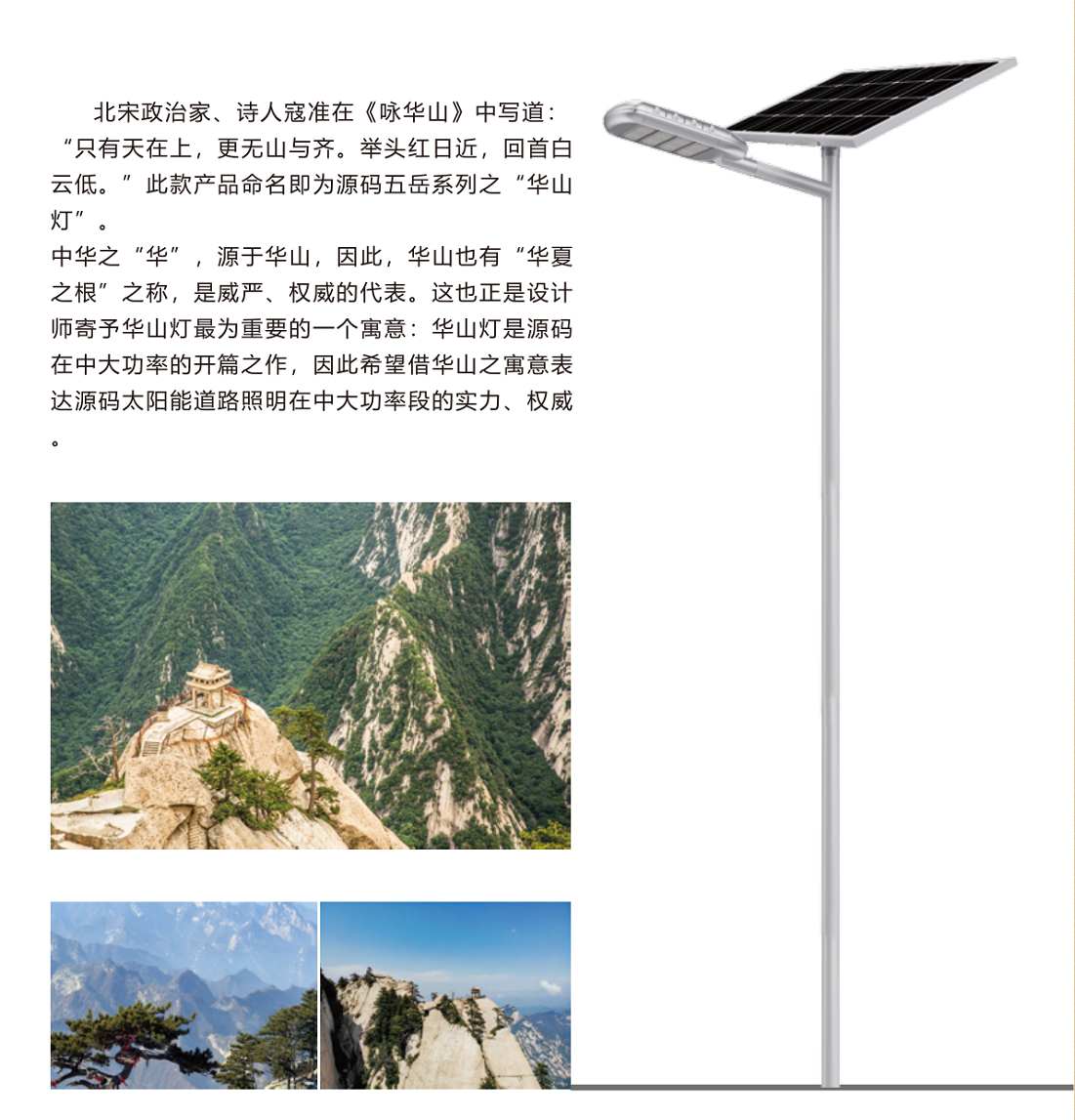 華山燈屬于高性價比的大功率分體式太陽能路燈,被廣泛應用于城市或鄉(xiāng)鎮(zhèn)主干道或次干道,以及高速路、工業(yè)園區(qū)、廣場等場景。