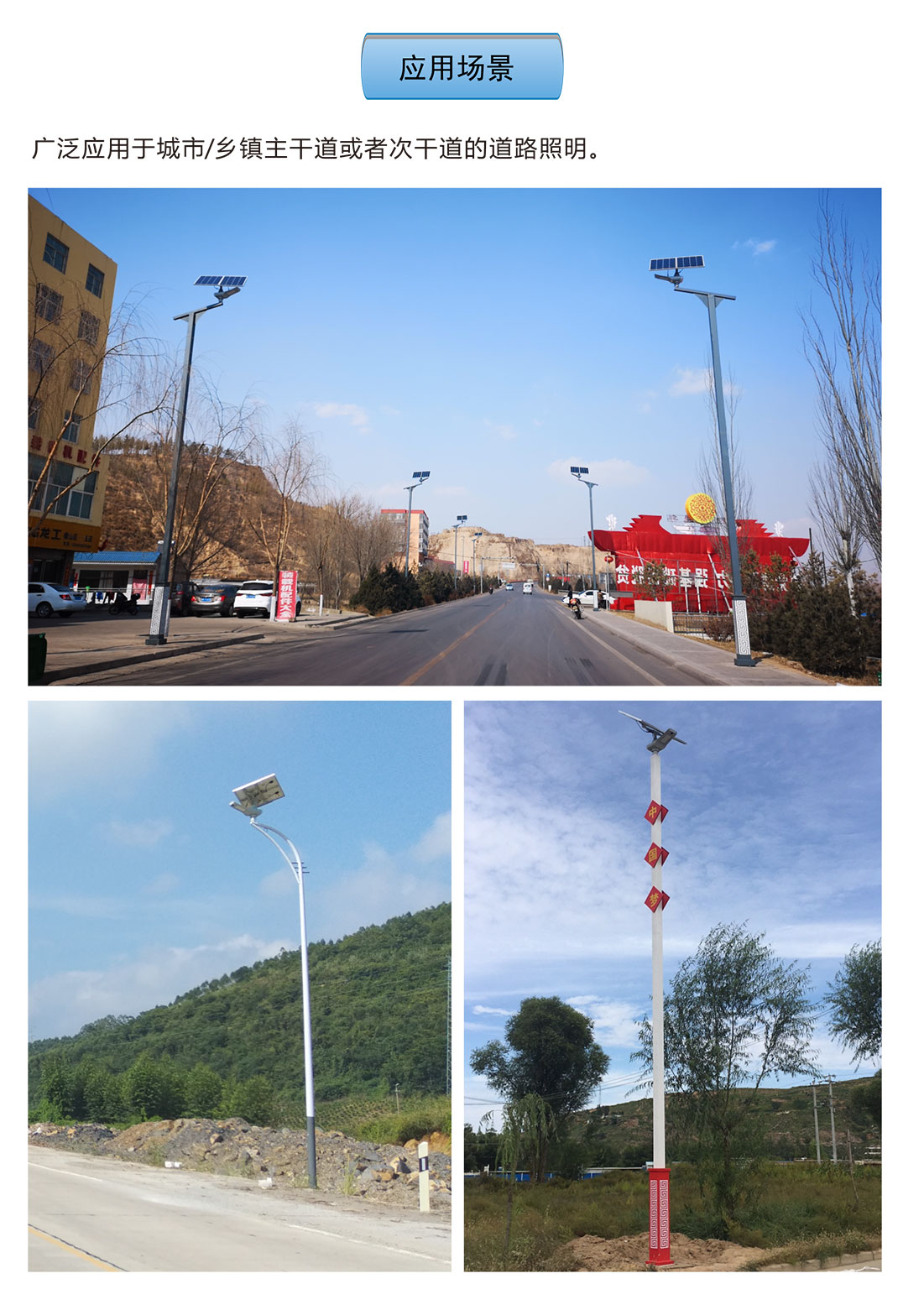 駿馬燈屬于中高端定位的中大功率太陽(yáng)能智慧路燈,被廣泛應(yīng)用于城市或鄉(xiāng)鎮(zhèn)主干道或次干道,以及工業(yè)園區(qū)、廣場(chǎng)等場(chǎng)景。